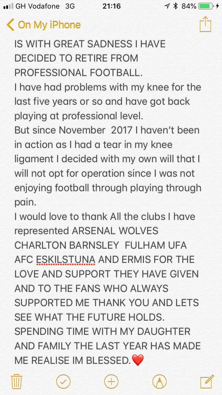 «J’ai eu des problèmes avec mon genou ces cinq dernières années et j’ai rejoué au niveau professionnel. Mais depuis novembre 2017, je n’ai pas joué parce que j’avais un problème au ligament du genou. Je voudrais remercier tous les clubs que j’ai représentés Arsenal, Wolves, Charlton, Barnsley, Fulham, UFA, AFC Eskilstuna et Ermis».