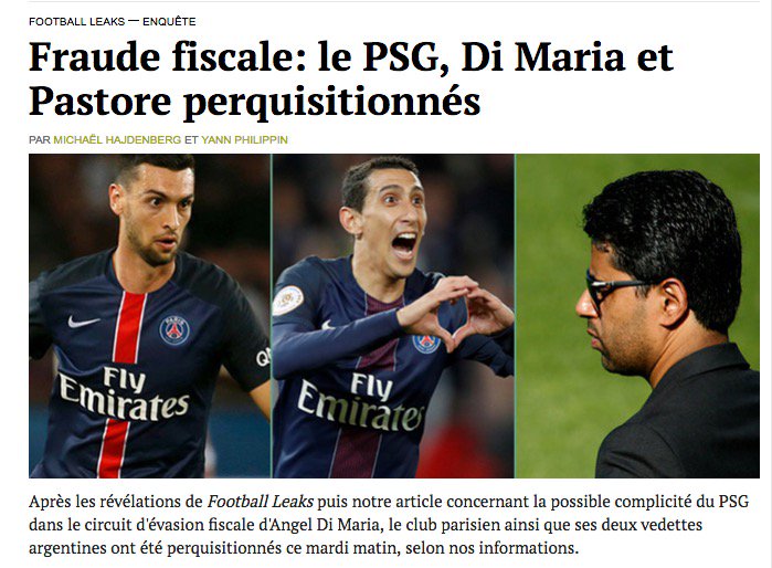 Les Football Leaks sont en train d’avoir des conséquences néfastes sur le Paris Saint-Germain et certains de ses joueurs. Rappelez-vous, le 8 décembre dernier, plusieurs médias européens, dont Mediapart pour la France, révélaient des dossiers compromettants au sujet d’Angel Di Maria et Javier Pastore, soupçonnés clairement d’évasion fiscale. Une partie de leurs revenus transiteraient en effet par des paradis fiscaux, dans un système mis en place par des agents argentins.
