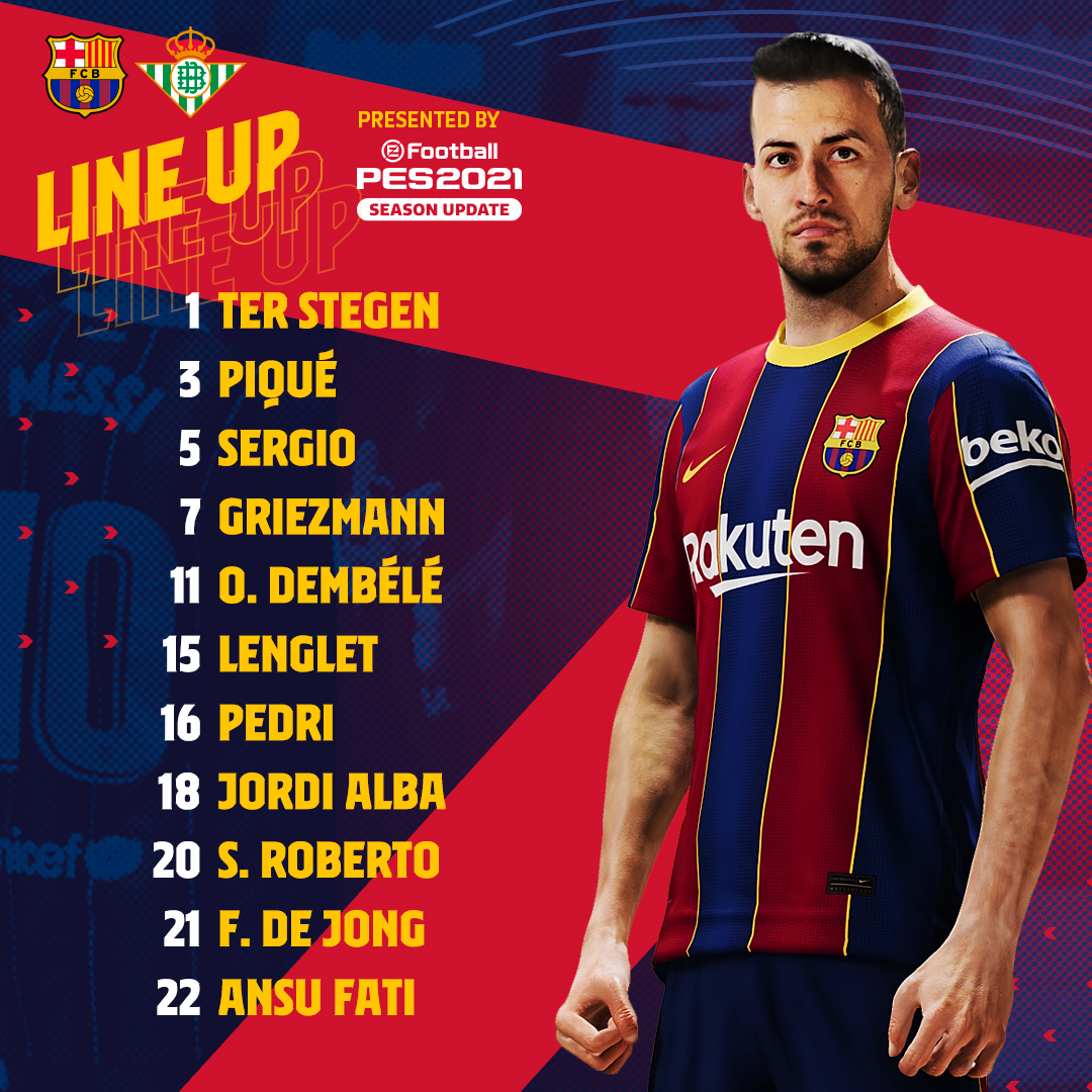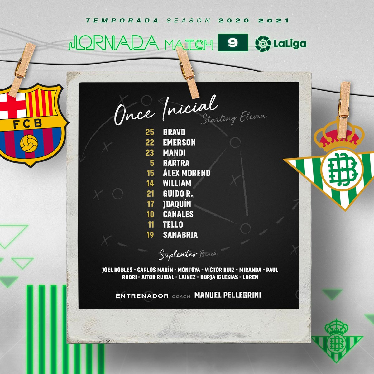 De retour de blessure, Ter Stegen est bien présent dans le but. Piqué et Lenglet font la paire en charnière centrale, accompagnés de Sergi Roberto et Jordi Alba. Busquets et De Jong formeront le duo du milieu, alors que Fati, Pedri et Dembélé seront chargés d’alimenter Griezmann à la pointe de l’attaque. En face, Manuel Pellegrini fait lui aussi confiance à un 4-2-3-1 avec Bravo dans les cages. Mandi et Batra en défense centrale avec Emerson et Moreno sur les côtés. Guido et William sont le double-pivot. En l’absence de Fékir, blessé et forfait avec les Bleus, Canales évolue en numéro 10 avec Joaquin et Tello en soutien de Sanabria en pointe.
