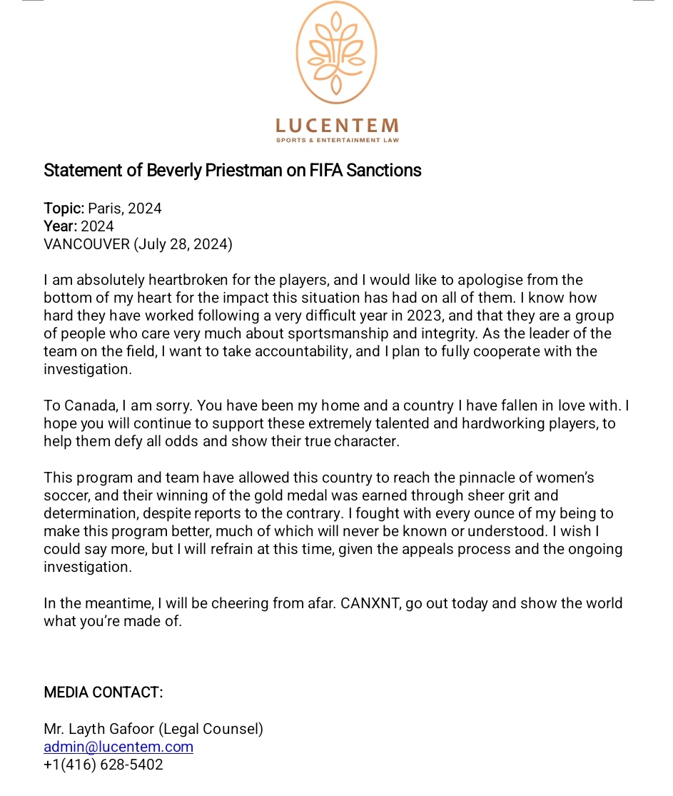 Bev Priesmann a vécu une semaine très compliquée. La sélectionneuse de l’équipe féminine du Canada a été punie pour le reste des Jeux olympiques, suite à l’affaire des drones. Elle a été ensuite suspendue de toutes activités liées au football par la FIFA, ce samedi. Deux membres de son staff ont également été sanctionnés. Deux membres de son staff ont aussi été sanctionnés. Silencieuse depuis le début de l’affaire, elle a publié un communiqué ce dimanche.