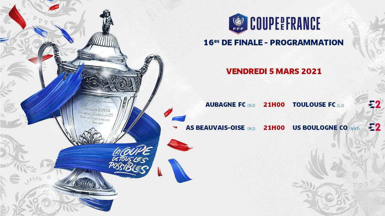 Ces 16es de finale s’ouvriront le vendredi 5 mars avec le déplacement de Toulouse sur la pelouse d’Aubagne (N2) et la réception de Boulogne (National) chez l’As Beauvais-Oise (N2). Le lendemain, samedi 6, 9 rencontres se disputeront avec notamment le déplacement de Montpellier à Alès-en-Cevennes (N3) à 14h15, le match entre l’Olympique Lyonnais et Sochaux-Montbéliard à 18h45 ainsi que la rencontre entre le Stade Brestois et le Paris Saint-Germain à 21h10. Dimanche, Lille se déplacera à Ajaccio pour affronter le Gazélec (N2) à 18h30, avant que Canet-Roussillon (N2) ne reçoive l’Olympique de Marseille à 21h. Et enfin, ces 16es de finale se termineront le lundi 8 avec la jolie rencontre entre Nice et Monaco à l’Allianz Riviera à 21h.
