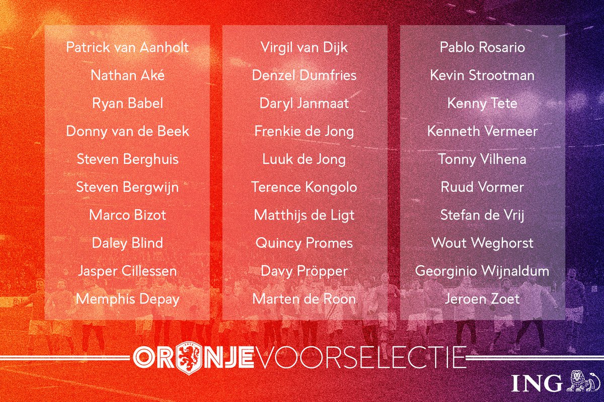 Deux échéances importantes puisque ce sont deux rencontres comptabilisant pour les éliminatoires de l’Euro 2020. On retrouve peu de surprises dans ce groupe avec les présences des Lyonnais Memphis Depay et Kenny Tete tout comme le Marseillais Kevin Strootman. Le vétéran Kenneth Vermeer qui a obtenu plus de temps de jeu ces dernières semaines avec le Feyenoord fait également son retour en sélection.