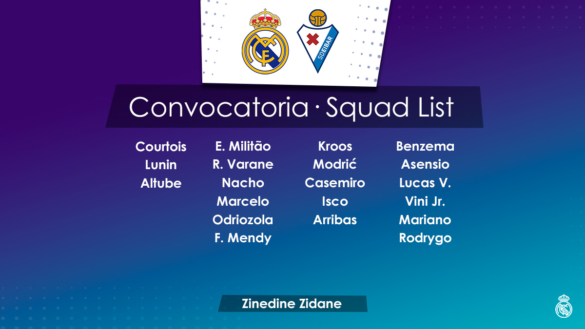 Sergio Ramos, touché en sélection, Eden Hazard, pour lequel le coach a déclaré «ne pas avoir de plan», Dani Carvajal et Fede Valverde sont absents de la liste communiquée par le Real Madrid. Toni Kroos fait lui son retour, tout comme Mariano Diaz et Alvaro Odriozola, qui reviennent de blessures. A noter la présence du jeune Arribas pour compléter le milieu de terrain.