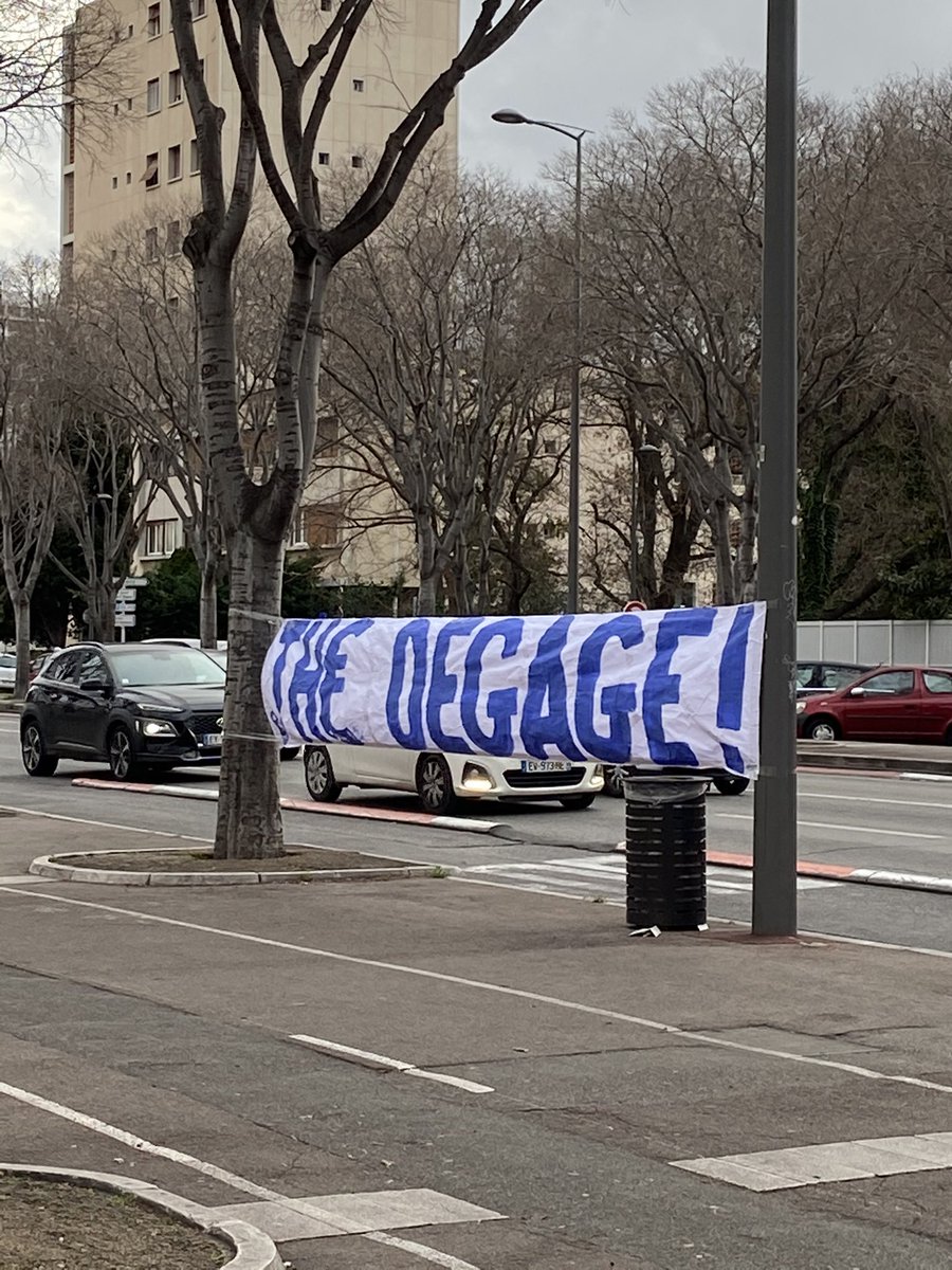 Les supporters marseillais ont disposé des affiches et banderoles un peu partout devant l’enceinte olympienne contre le président marseillais. Des affiches où l’on peut voir écrit « Eyscraud dégage » - un savant mélange entre le nom du dirigeant et le titre d’escroc - ou « JHE dégage » comme révélé par Téléfoot. Ambiance.