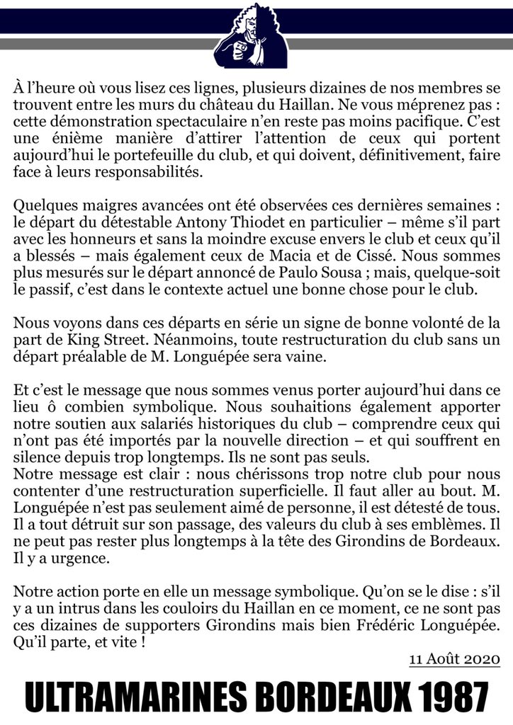 Les Ultra Marines ont également publié un communiqué. «Quelques maigres avancées ont été observées ces dernières semaines: le départ du détestable Antony Thiodet en particulier - même s’il part avec les honneurs et sans la moindre excuse envers le club et ceux qu’il a blessés - mais également ceux de Macia et Cissé, ont déclaré les ultras bordelais via un communiqué. Nous sommes plus mesurés sur le départ annoncé de Paulo mais quelque soit le passif, c’est dans le contexte actuel une bonne chose pour le club. Nous voyons dans ces départs en série un signe de bonne volonté de la part de King Street. Néanmoins, toute restructuration du club sans un départ de Frédéric Longuépée sera vaine.» Le président-délégué et ces supporters sont en conflit ouvert depuis des mois maintenant.