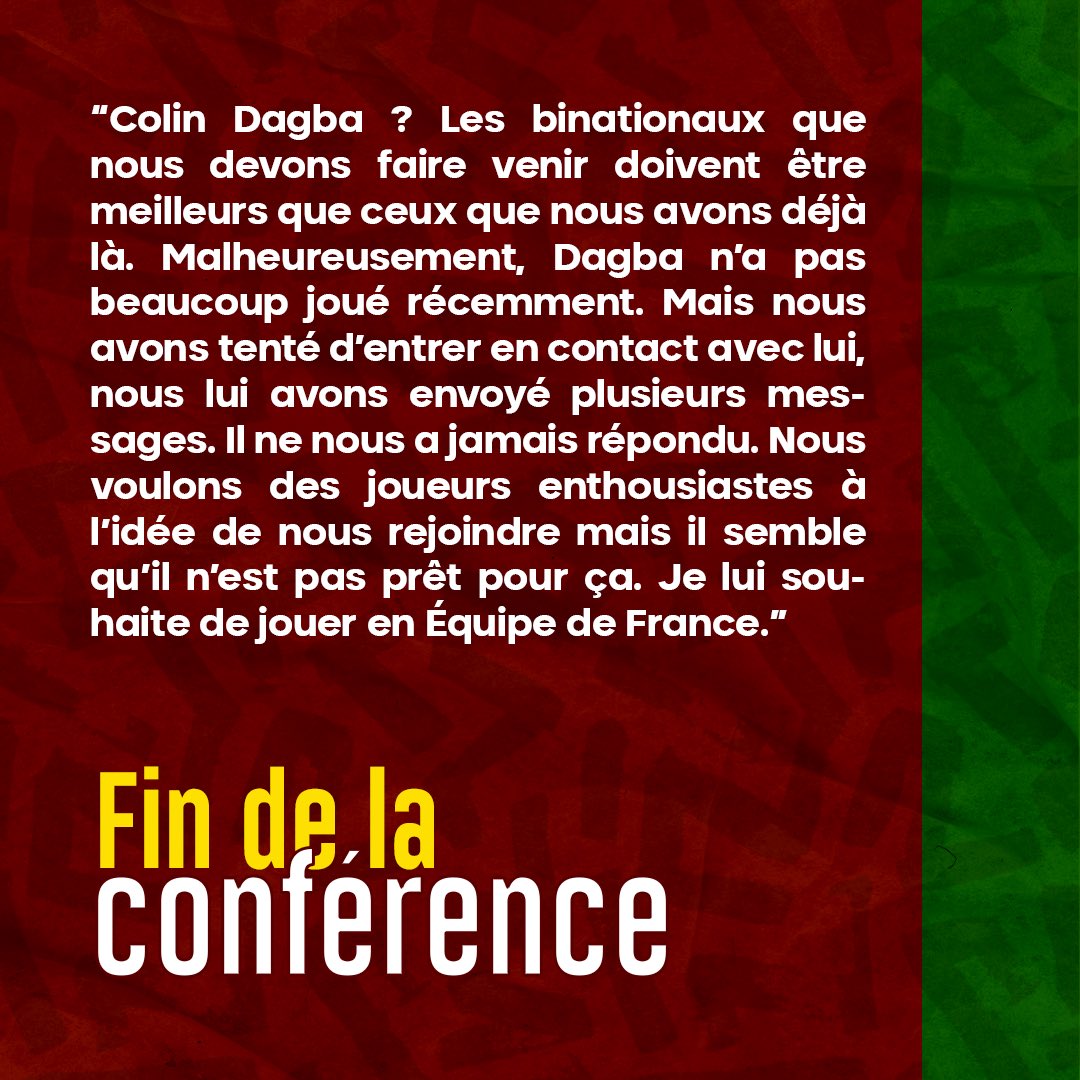 « Les binationaux que nous devons faire venir doivent être meilleurs que les joueurs qui sont déjà dans le groupe. Colin Dagba n’a pas beaucoup joué. Mais nous avons tenté d’entrer en contact avec lui. Nous lui avons envoyé plusieurs messages, mais il ne nous a jamais répondu. Nous voulons des joueurs enthousiastes à l’idée de nous rejoindre, mais il semble qu’il n’est pas prêt pour ça. Je lui souhaite de jouer en équipe de France », a-t-il confié en conférence de presse.