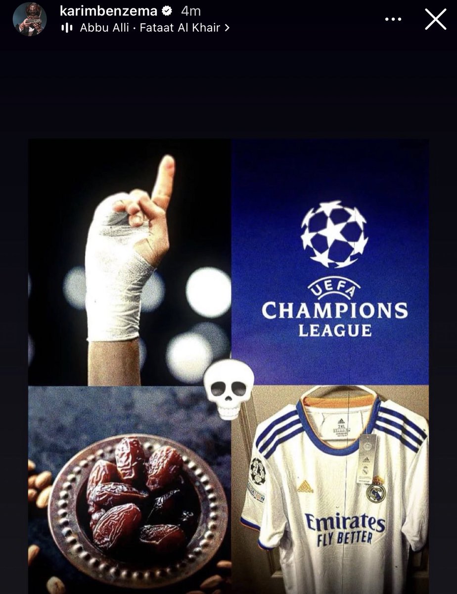 On y voit notamment le logo de la Ligue des Champions, un maillot du Real Madrid, son doigt qui pointe vers le ciel et quelques dattes, et au milieu, un emoji tête de mort. Chacun interprètera cette story à sa façon !