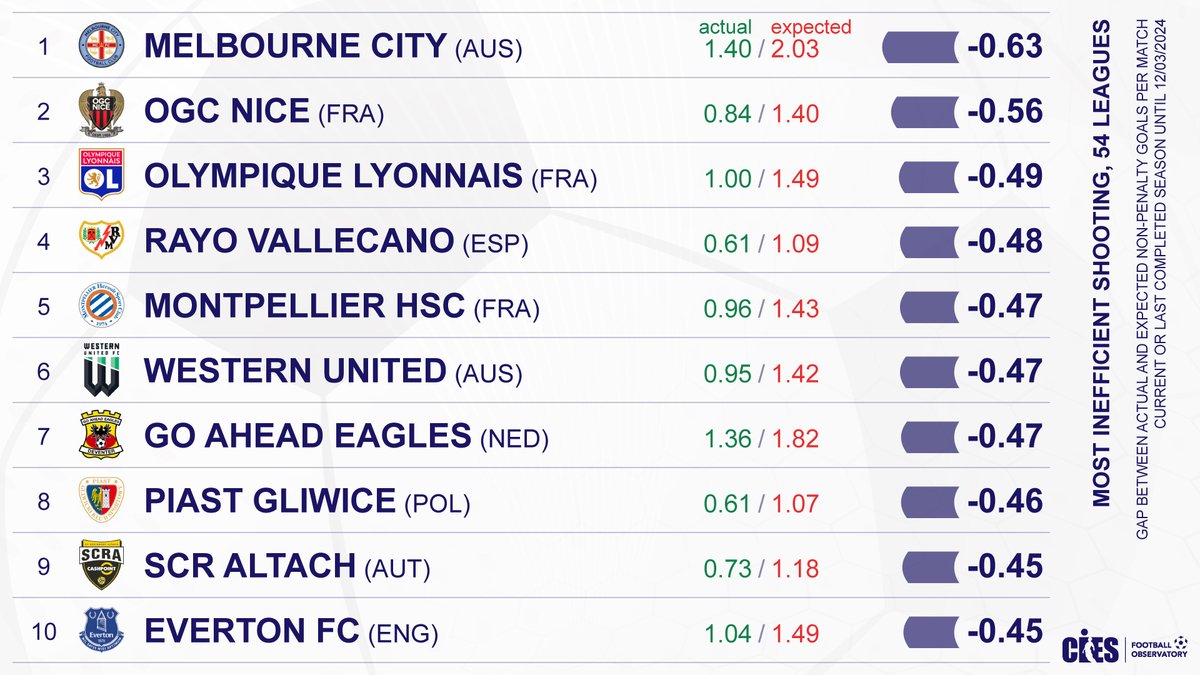 En difficulté sur les dernières semaines, Nice reste sur quatre défaites et deux matches nuls lors des six dernières rencontres du championnat. Descendus à la sixième place de Ligue 1, les Aiglons peuvent notamment regarder du côte de leur secteur offensif eux qui comptent seulement 24 buts en 25 matches. Ce manque d’efficacité est particulièrement frappant puisque d’après le CIES et après avoir analysé 54 championnats à travers le monde, seul le club australien de Melbourne City a une moins bonne efficacité (-0,63). Les Niçois marquent 0,56 but de moins par match que prévu. Si l’on ramène cela sur 25 journées, cela veut dire que Nice aurait dû marquer 14 buts de plus cette saison que ce que le club a réellement fait.