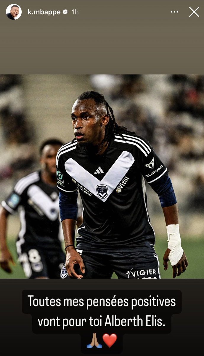 L’attaquant du Paris Saint-Germain Kylian Mbappé (25 ans) a adressé un message de soutien en direction de son homologue bordelais. «Toutes mes pensées positives vont pour toi Alberth Elis.» En espérant qu’il soit rapidement sorti d’affaires.