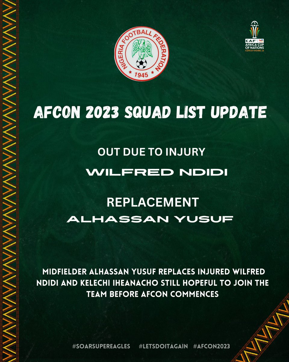Le Fox sera remplacé par le joueur du Royal Antwerp Alhassan Yusuf (23 ans), qui a notamment disputé la Ligue des champions 2023-24 face au Barça ou encore Porto. Pour rappel, les Super Eagles seront dans le groupe A de ce tournoi en compagnie du pays-hôte, la Côte d’Ivoire, la Guinée Equatoriale et la Guinée Bissau. Un groupe corsé pour une sélection qui n’a plus connu le sacre final depuis 2013.