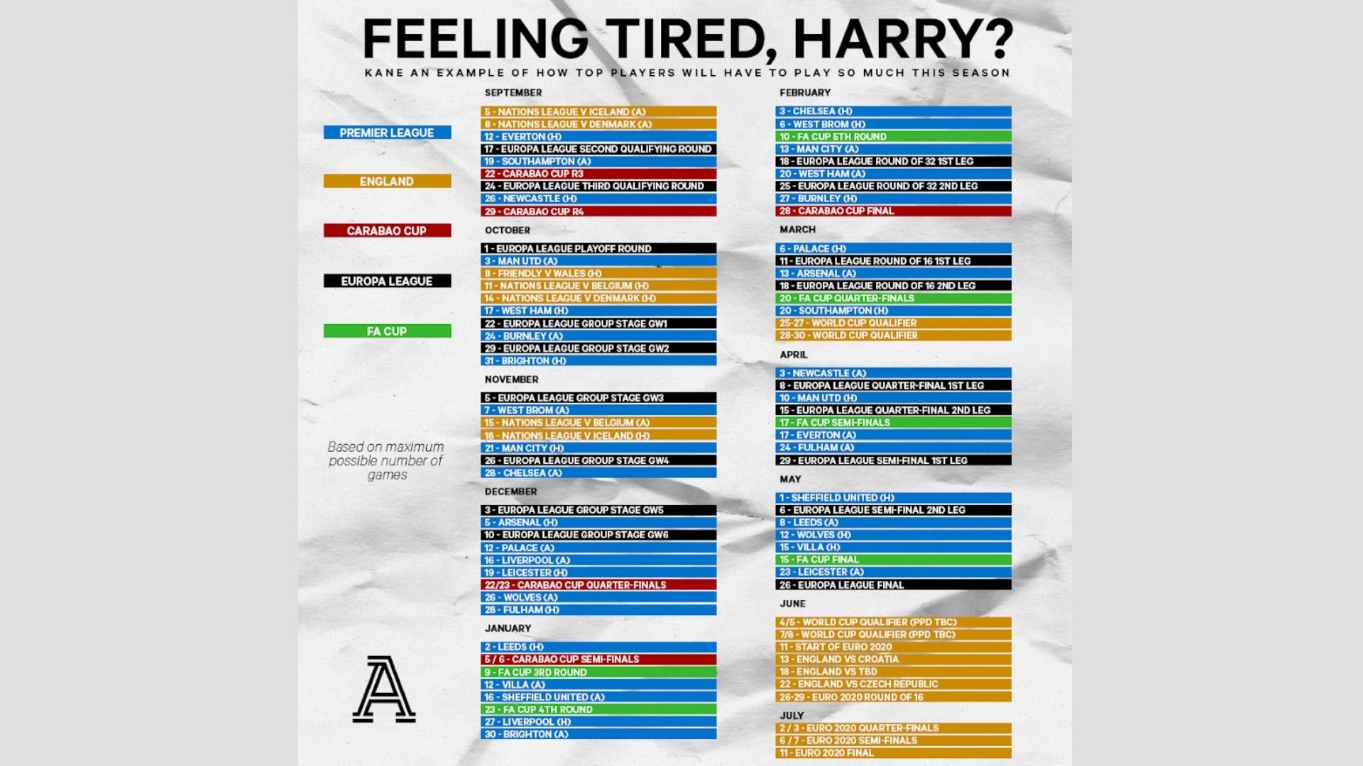 Le site The Athletic avait publié une photo (voir ci-dessus) avec le nombre de matches potentiels que pourrait disputer Harry Kane lors de cette saison 2020-2021 entre Tottenham et la sélection anglaise. Et le résultat était sans appel avec 85 matches dont 78 matches potentiels avant l’Euro 2021 ! Des chiffres ahurissants qui interpellent et qui nécessitent évidemment une adaptation du côté des entraîneurs.