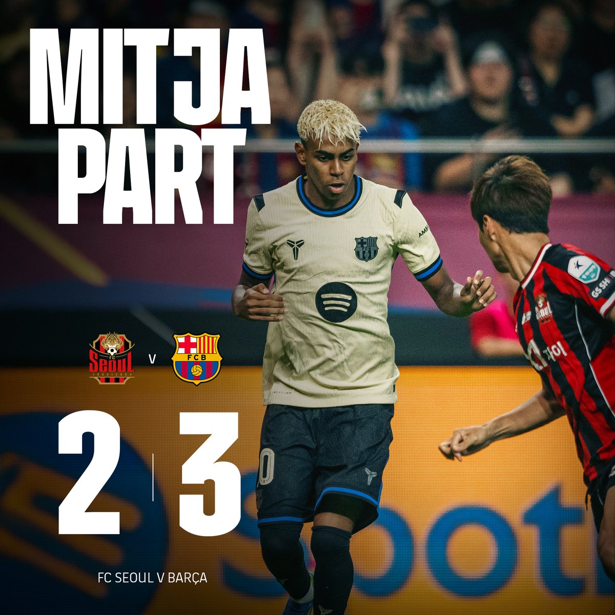 Le FC Barcelone reprend l’avantage juste avant la pause grâce à un deuxième but de Lamine Yamal. Tout reste ouvert dans ce match animé contre une équipe de Séoul efficace.