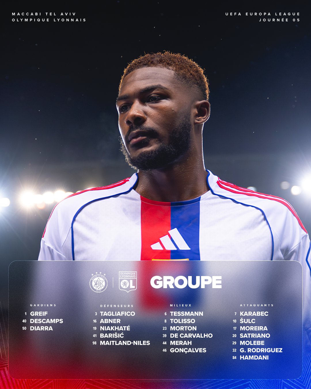L’Olympique Lyonnais a dévoilé son groupe pour affronter le Maccabi Tel Aviv en Ligue Europa ce jeudi, un match déplacé à Backa Topola, en Serbie, et plusieurs absences importantes y figurent. Blessé à la jambe droite contre Auxerre, Clinton Mata n’est pas du voyage, tout comme Ruben Kluivert, touché à la cheville. Dans ce contexte, Téo Barišić pourrait enfin avoir sa chance : le défenseur croate de 21 ans, très peu utilisé jusque-là, se retrouve seule option naturelle pour accompagner Moussa Niakhaté en charnière. À noter que Nicolas Tagliafico et Tyler Morton, suspendus en Ligue 1 le week-end dernier, réintègrent le groupe.