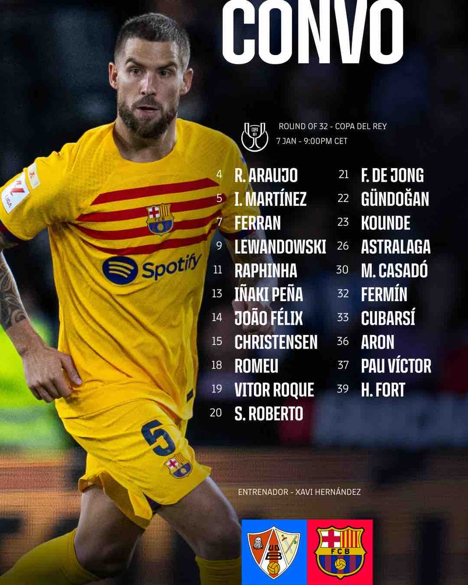 Pour cette première affiche de coupe pour la saison, l’entraîneur catalan Xavi Hernandez a dévoilé son groupe convoqué pour le déplacement en Aragon. Le technicien blaugrana pourra compter sur la présence de son défenseur central espagnol Iñigo Martinez, qui a reçu l’aval du staff médical. La recrue hivernale Vitor Roque est également présente, et pourrait même être titularisé si son coach profitait de la Copa pour faire tourner.