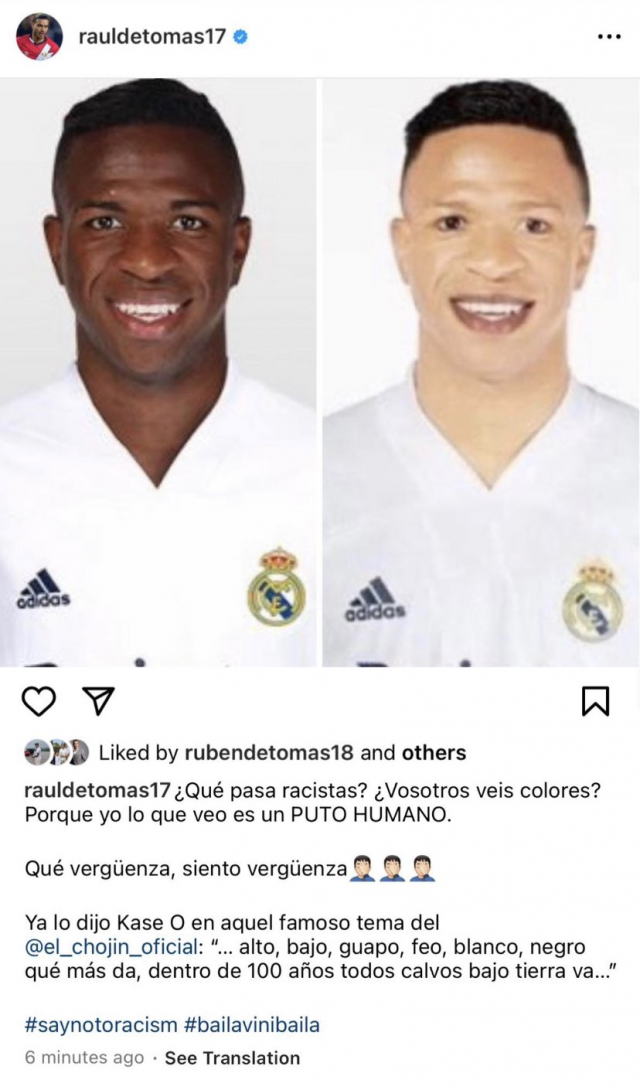 «Quoi de neuf les racistes ? Voyez-vous des couleurs? Parce que ce que je vois, c’est un putain d’Humain. Quel dommage, j’ai honte. Kase O l’a déjà dit dans sa célèbre chanson avec El Chojin, grand, petit, beau, laid, blanc, noir, qu’importe, dans 100 ans tout le monde sera chauve sous terre…» peut-on lire avec une photo de Vinicius avec la peau blanche.