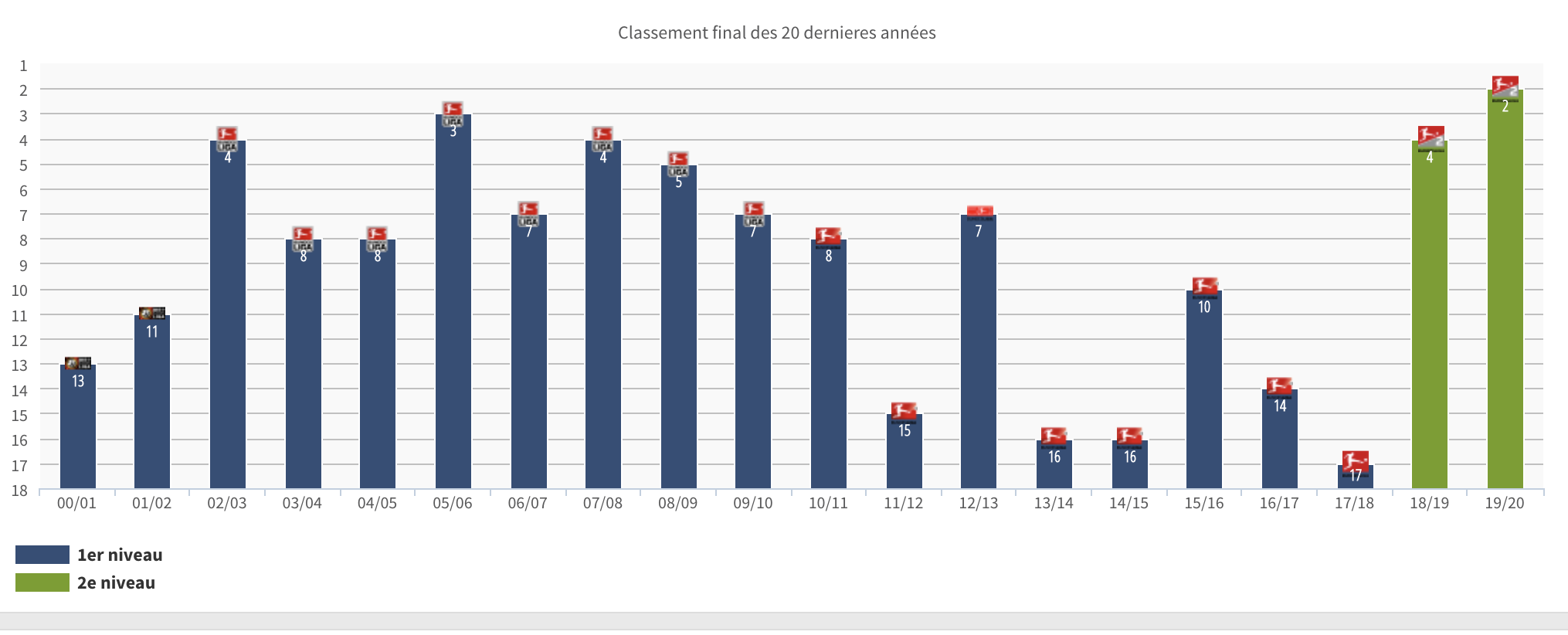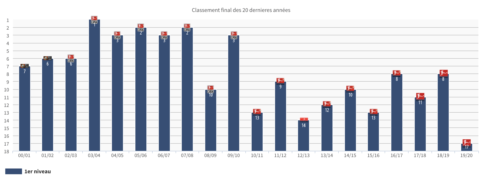 Evolution du classement du Werder Brême sur les vingt dernières saisons (Transfermarkt)