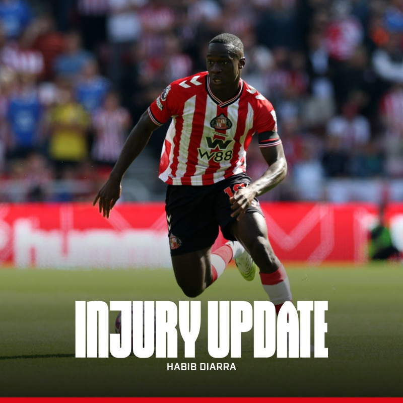 «Le milieu de terrain de Sunderland AFC Habib Diarra a été opéré avec succès lundi. Après s’être blessé à l’aine à l’entraînement avant le match de Premier League contre Aston Villa, le joueur de 21 ans va maintenant entamer une période de rééducation à l’Academy of Light. Diarra, qui a quitté le RC Strasbourg en juillet pour s’installer à Wearside, devrait reprendre la compétition en décembre. Nous te souhaitons un bon rétablissement, Habib !»