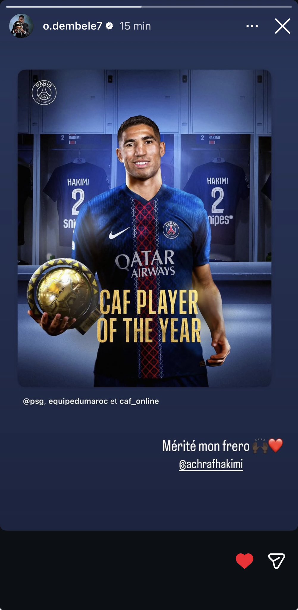 Ousmane #dembele félicite Achraf Hakimi pour son titre de meilleur joueur africain de l’année !