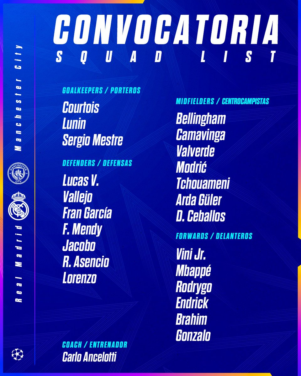 Toujours pas remis de sa blessure, le défenseur central allemand Antonio Rudiger n’est pas présent dans le groupe, continuant d’handicaper la défense avec les absences depuis le début de la saison d’Eder Militao et Dani Carvajal. Au niveau de l’attaque, le quatuor de star Kylian Mbappé, Vinicius, Jude Bellingham et Rodrygo est bien présent, au même titre que les français Aurélien Tchouaméni, Ferland Mendy et Eduardo Camavinga.