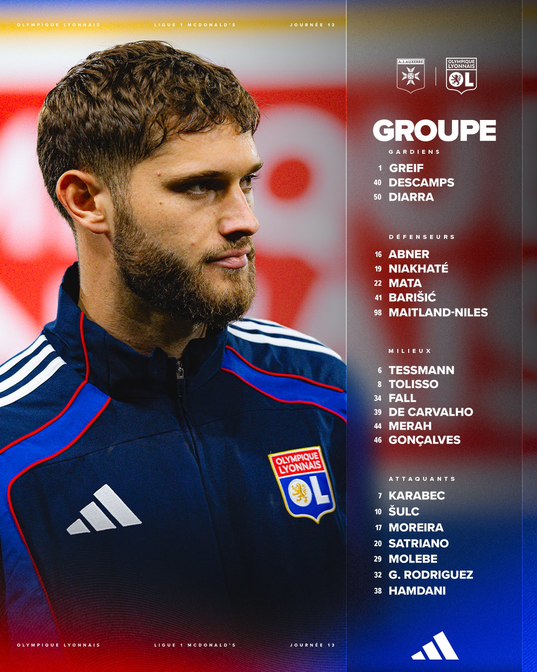 Un déplacement qui se fera avec de nombreux absents. Avec de nombreux joueurs suspendus (Morton, Tagliafico), l’OL doit aussi composer avec des absences majeures (Fofana, Nuamah, Kluivert, Ghezzal). Dès lors, Paulo Fonseca a convoqué de nombreux jeunes joueurs. Alors que Khalis Merah, Alejandro Gomes Rodriguez, Enzo Molebé ou encore Téo Barisic sont convoqués, Ibrahima Fall et Adil Hamdani, jeune ailier prometteur de 16 ans, sont appelés pour la première fois.