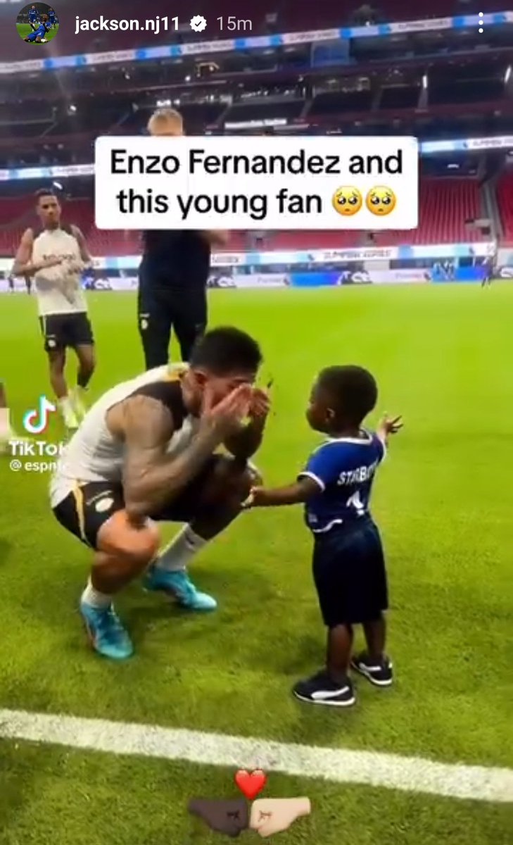 Dans la tourmente par rapport à sa vidéo polémique avec l’Argentine, où lui et certains de ses coéquipiers entonnent un chant raciste contre l’équipe de France, Enzo Fernández peut bénéficier du soutien d’un de ses coéquipiers en club, Nicolas Jackson. En effet, le Sénégalais a publié une vidéo de l’Argentin, avec un petit garçon noir, ainsi qu’une photo avec lui, dans sa story Instagram.