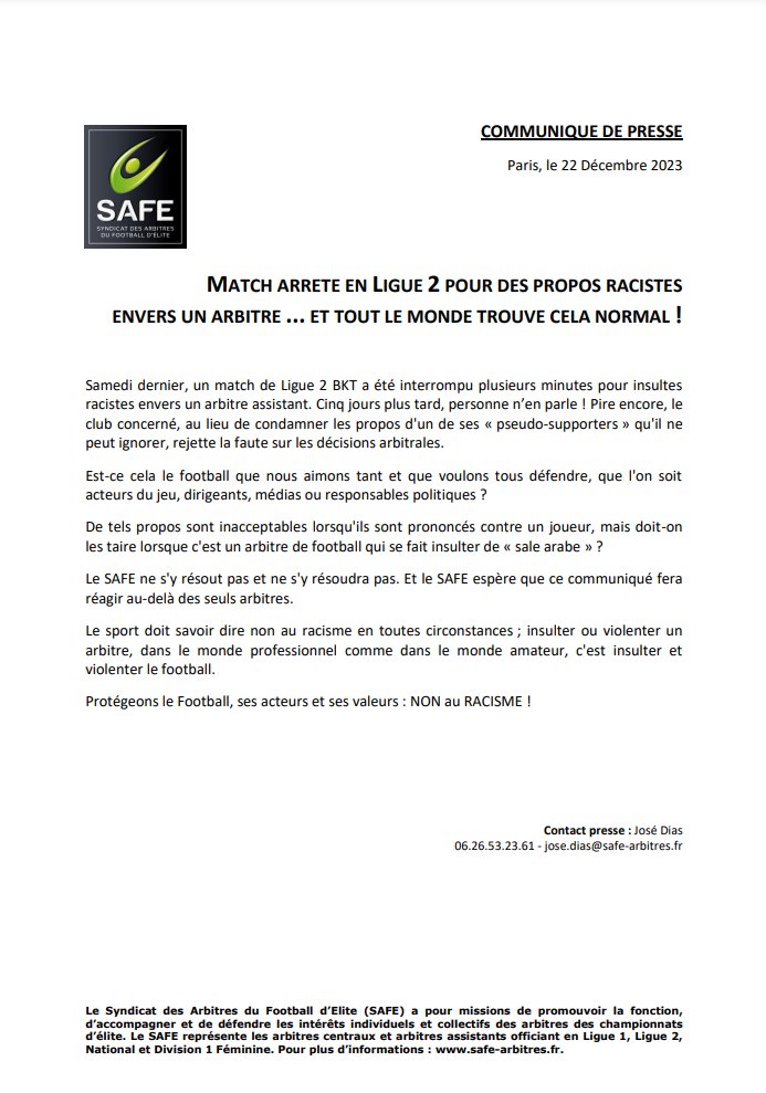 Au regard de la gravité des faits, le SAFE a publié un communiqué incendiaire en reprenant de volée le SC Bastia qui avait réagi en marge de la parution du Procès-verbal de la Ligue en pestant contre l’arbitrage. «Samedi dernier, un match de Ligue 2 BKT a été interrompu plusieurs minutes pour des insultes racistes envers un arbitre assistant. Cinq jours plus tard, personne n’en parle ! Pire encore, le club concerné, au lieu de condamner les propos d’un de ses "pseudo-supporters" qu’il ne peut ignorer, rejette la faute sur les décisions arbitrales… De tels propos sont inacceptables lorsqu’ils sont prononcés contre un joueur, mais doit-on les taire lorsque c’est un arbitre qui se fait insulter de "sale arabe" ?», peut-on lire au sein du communiqué du SAFE. Pour rappel, la LFP rendra son verdict sur cette affaire le mercredi 17 janvier 2024.