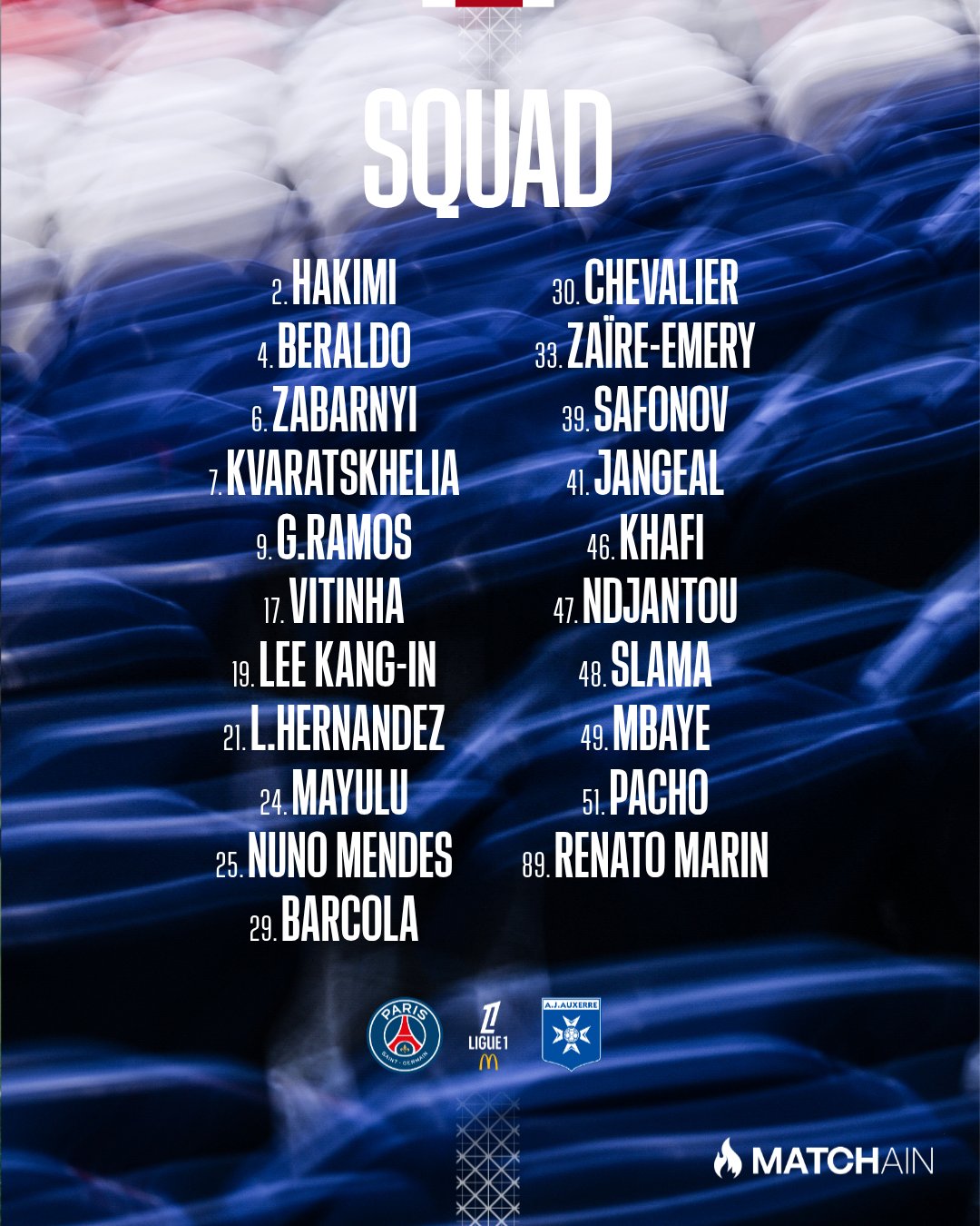 En effet, plusieurs cadres manquent à l’appel pour cette rencontre : Fabian Ruiz, João Neves, Désiré Doué, Marquinhos et Ousmane Dembélé sont forfaits. En revanche, Khvicha Kvaratskhelia et Illia Zabarniy, et Lucas Chevalier sont bien présents. La recrue ukrainienne devrait suppléer Marquinhos en défense centrale aux côtés de Pacho, tandis que Kvaratskhelia occupera un des couloirs. Hakimi sera logiquement aligné sur son flanc droit. Le coup d’envoi est prévu à 21h05, au Parc des Princes.