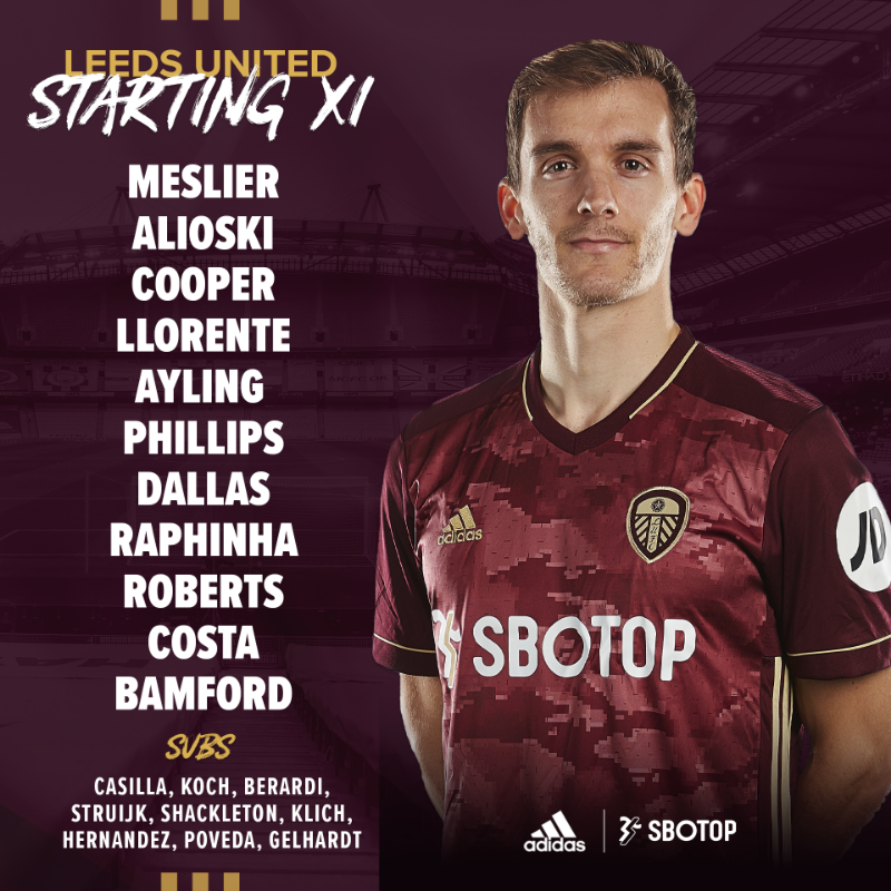 Leeds : Meslier - Ayling, Llorente, Cooper, Alioski - Phillips - Costa, Dallas, Roberts, Raphinha - Bamford.