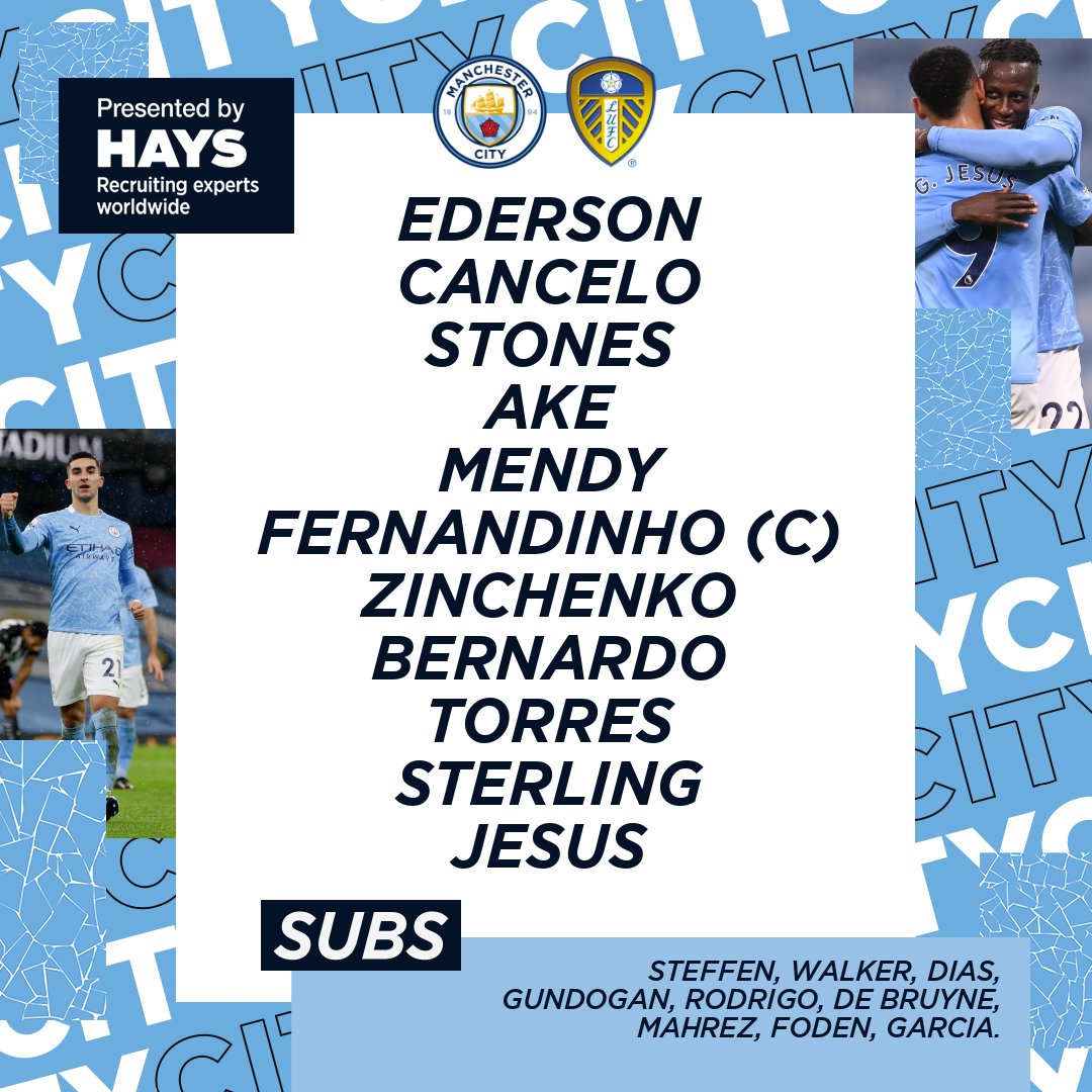 XI | Ederson, Cancelo, Stones, Ake, Mendy, Fernandinho (C), Zinchenko, Bernardo, Torres, Sterling, Jesus