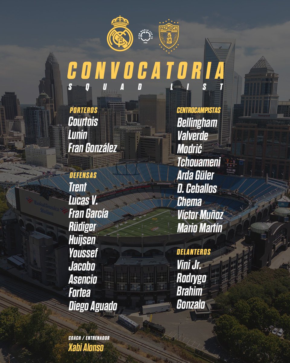 À l’occasion de la deuxième journée de la Coupe du Monde des Clubs, le Real Madrid affrontera le CF Pachuca au Bank of America Stadium de Charlotte, dimanche soir. Et au sortir d’un nul décevant contre Al-Hilal (1-1), Xabi Alonso a convoqué un groupe quasi-complet avec Courtois, Rüdiger, Modrić, Valverde, Bellingham, Tchouaméni, Vinicius Jr ou Rodrygo seront bien présents, à l’instar des recrues de l’été Trent Alexander-Arnold et Dean Huijsen.