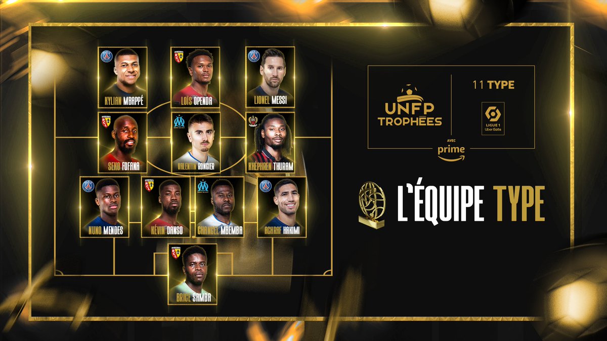 Et cette saison, le Paris Saint-Germain, le RC Lens, l’Olympique de Marseille et l’OGC Nice ont été représentés. Quatre joueurs du Paris Saint-Germain sont en effet présents cette année de ce XI type. On retrouve d’abord Brice Samba, nommé meilleur gardien de l’élite un peu plus tôt dans la soirée. Il y a aussi le Portugais Nuno Mendes au poste de latéral gauche, qui a remporté celui de meilleur espoir. On retrouve également Achraf Hakimi (PSG), Kevin Danso (Lens) et Chancel Mbemba (OM) dans ce 4-3-3 concocté par l’UNFP.