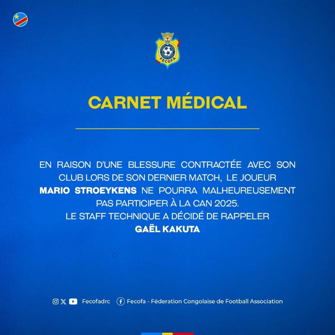 « En raison d’une blessure contractée avec son club lors de son dernier match, le joueur Mario Stroeykens ne pourra malheureusement pas participer à la CAN 2025. Le staff technique a décidé de rappeler Gaël Kakuta », indique la fédération congolaise (Fecofa) sur ses réseaux officiels.