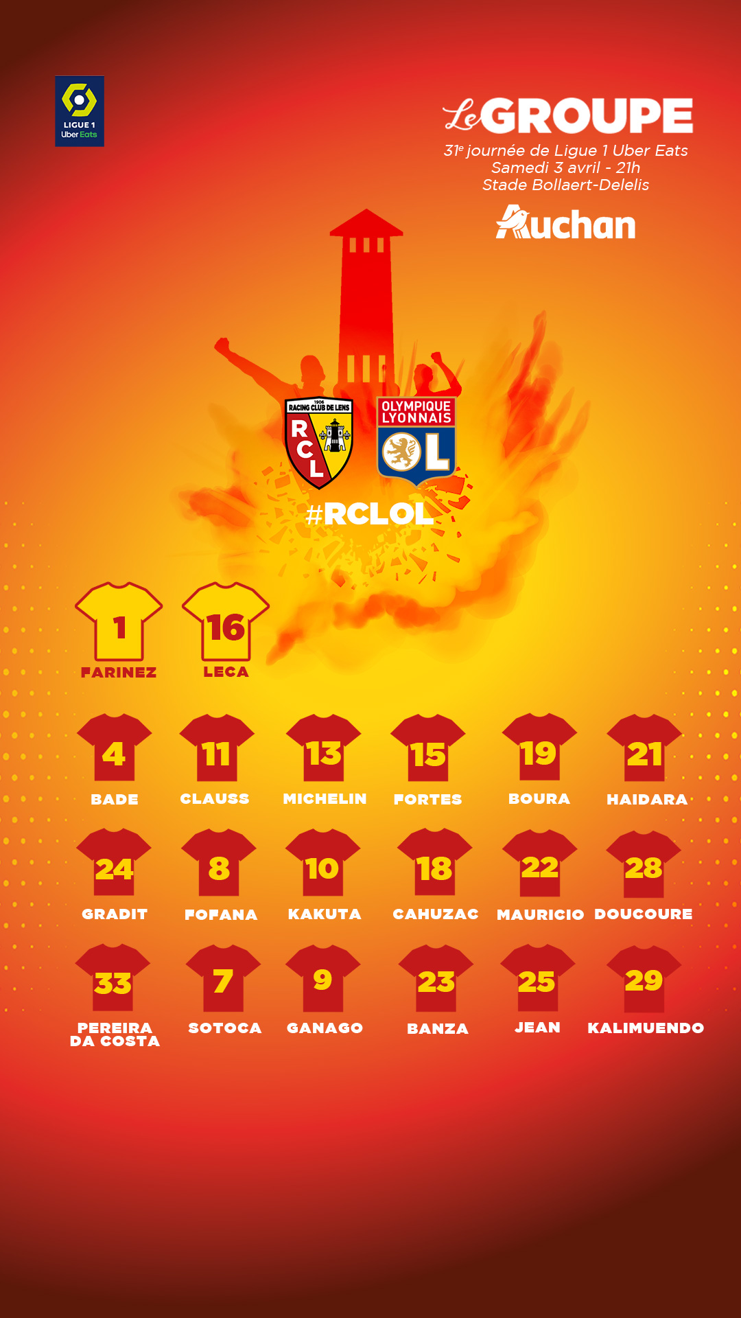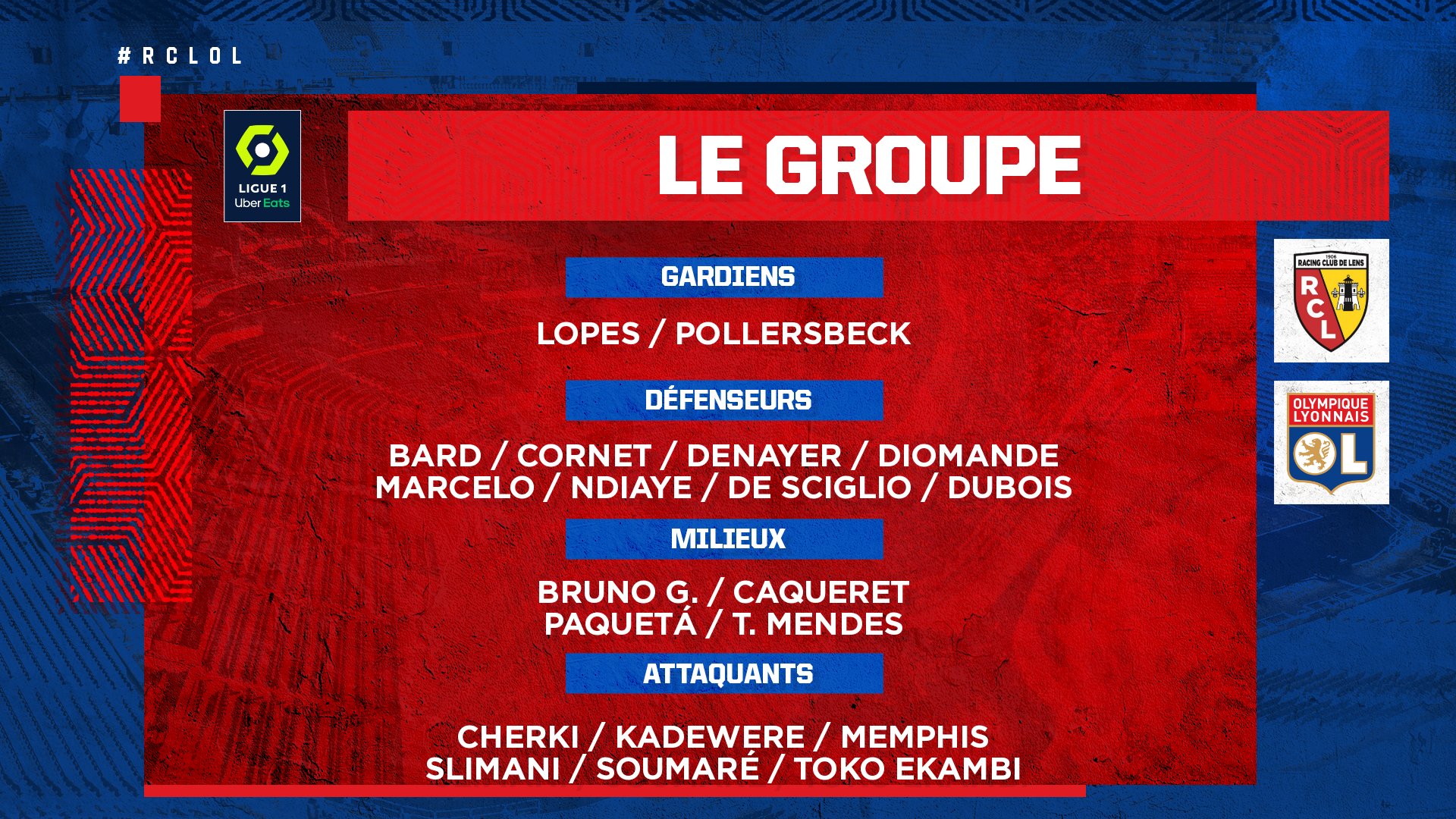 Pour cette rencontre comptant pour la 31e journée de Ligue 1, Rudi Garcia comptera sur un groupe de 20 joueurs. Seuls manquent à l’appel Houssem Aouar et Djamel Benlamri. La jeunesse, représentée par Melvin Bard, Maxence Caqueret et Rayan Cherki est au rendez-vous de Bollaert.