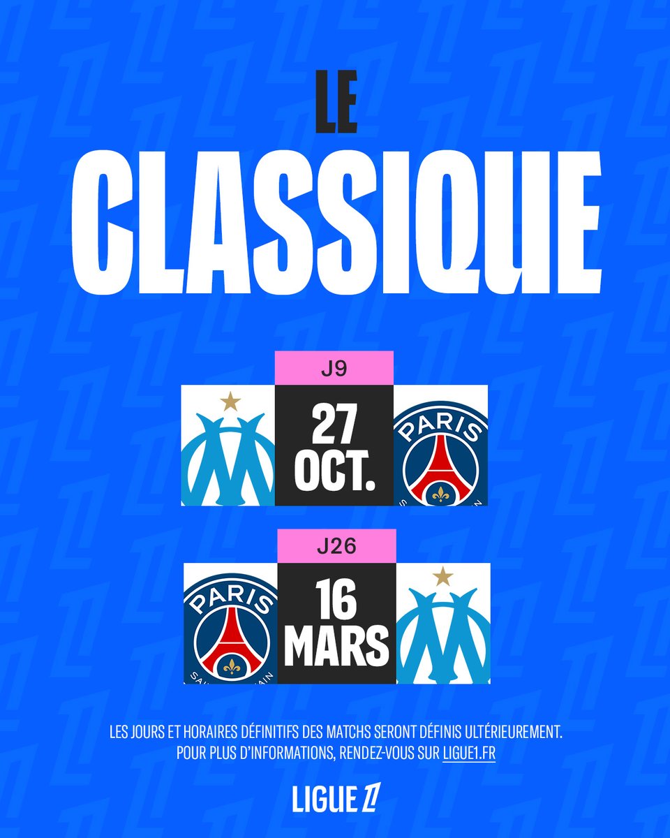 Le match aller se jouera le 27 octobre à l’Orange Vélodrome dans le cadre de la 9e journée. Le retour se disputera au Parc des Princes le 16 mars, lors de la 26e journée.