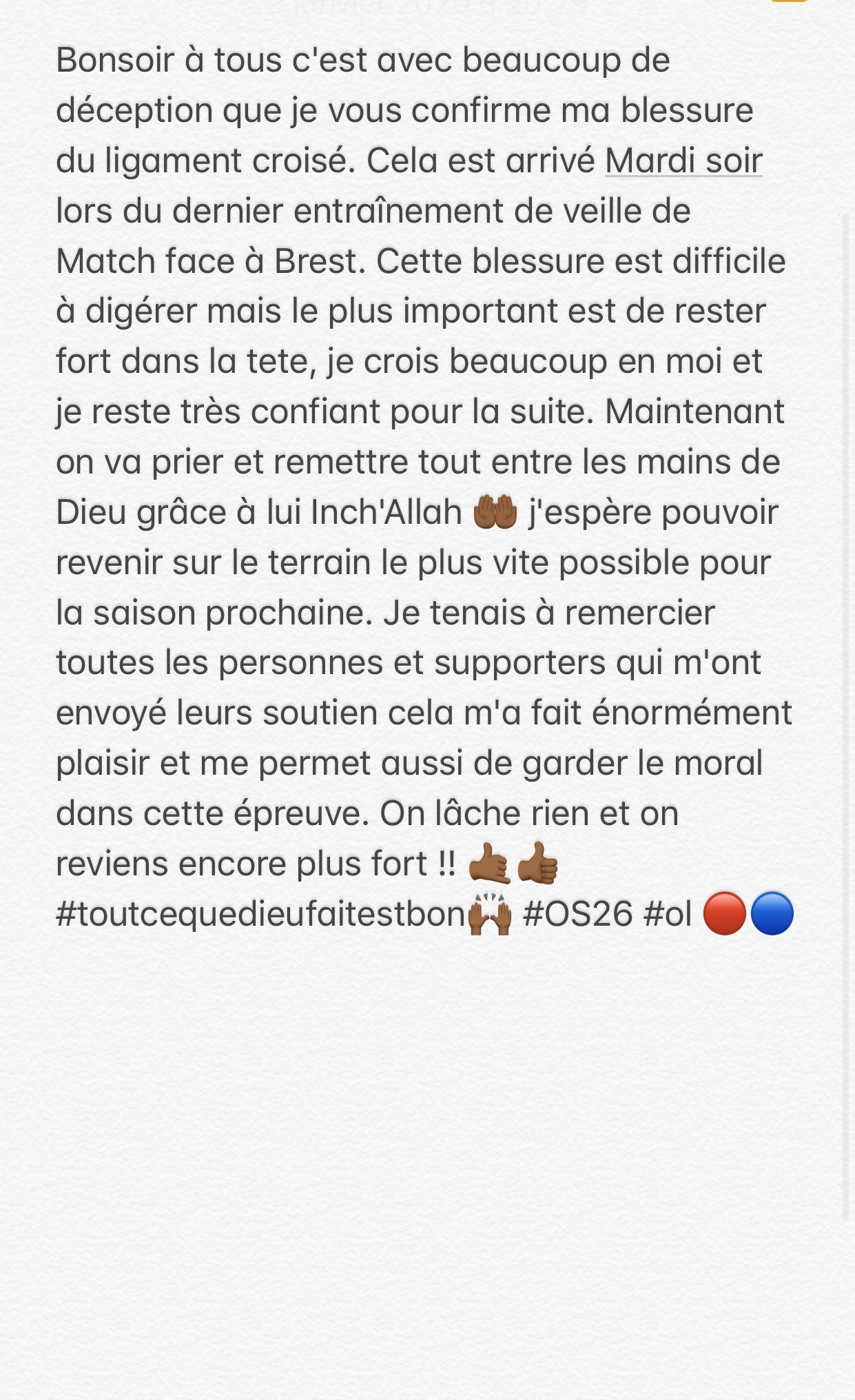 «Cette blessure est difficile à digérer mais le plus important est de rester fort dans la tête. Je crois beaucoup en moi et je reste très confiant pour la suite. (…) J’espère pouvoir revenir sur le terrain le plus vite possible pour la saison prochaine», a notamment expliqué le Gone sur le réseau social. Pour rappel, Oumar Solet sera opéré mardi.