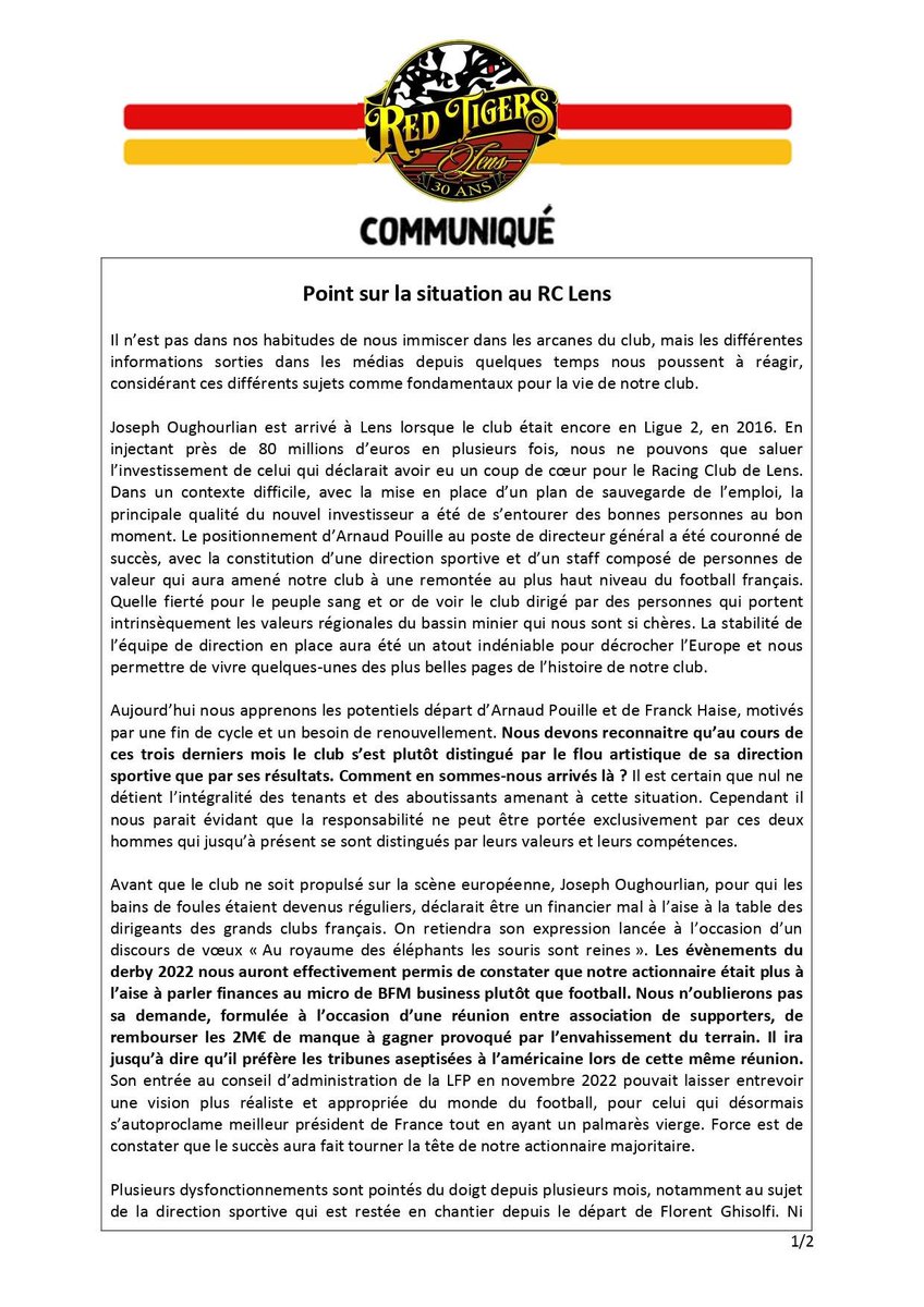 «Il n’est pas dans nos habitudes de nous immiscer dans les arcanes du club», a d’abord rappelé le groupe sur X. «Aujourd’hui nous apprenons les potentiels départs d’Arnaud Pouille et de Franck Haise, motivés par une fin de cycle et un besoin de renouvellement. Nous devons reconnaitre qu’au cours de ces 3 derniers mois le club s’est plutôt distingué par le flou artistique de sa direction sportive que par ses résultats», reconnaissent ensuite les Red Tigers, lassés par la situation en interne. Pour autant, ils n’oublient pas l’apport considérable de l’actionnaire Joseph Oughourlian, faisant passer Lens de la Ligue 2 à la Ligue des Champions cette saison. Mais ils ont tenu à lui envoyer un message clair. «Nous appelons Joseph Oughourlian à retrouver la raison, l’humilité et les valeurs qui correspondent à cette région, ce club et ses fans. Nous serons attentifs aux prochaines décisions et officialisations, convaincus qu’il n’est pas trop tard pour bien faire. Le cas échéant, nous agirons pour le bien de l’institution. Allez Lens !», ont-ils conclu.