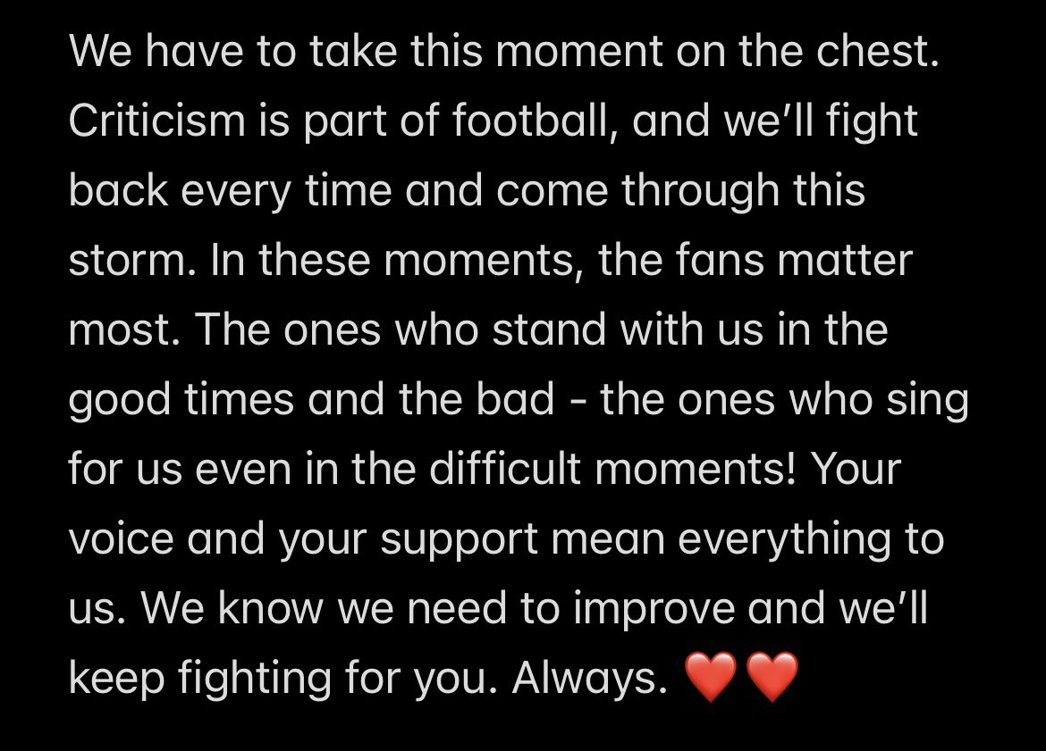 «Nous devons encaisser ce moment avec courage. Les critiques font partie intégrante du football, et nous nous battrons à chaque fois pour surmonter cette épreuve. Dans ces moments-là, ce sont les supporters qui comptent le plus. Ceux qui sont à nos côtés dans les bons comme dans les mauvais moments, ceux qui chantent pour nous dans les moments difficiles ! Votre voix et votre soutien sont essentiels. Nous savons que nous devons progresser et nous continuerons à nous battre pour vous. Toujours.» Le message est passé.