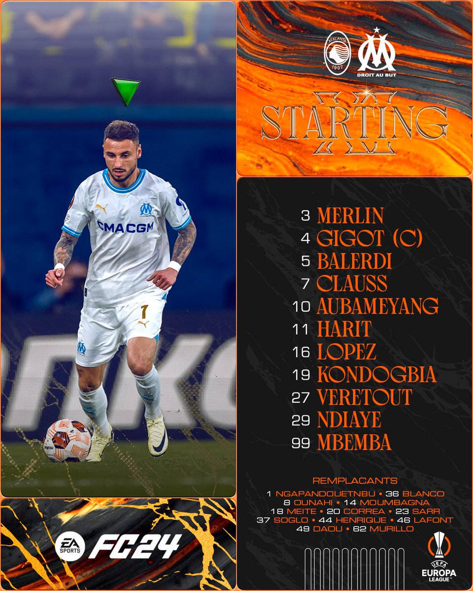 Le onze de départ : Lopez - Clauss, Mbemba, Gigot © Balerdi - Merlin, Veretout, Kondogbia, Harit - Ndiaye, Aubameyang.