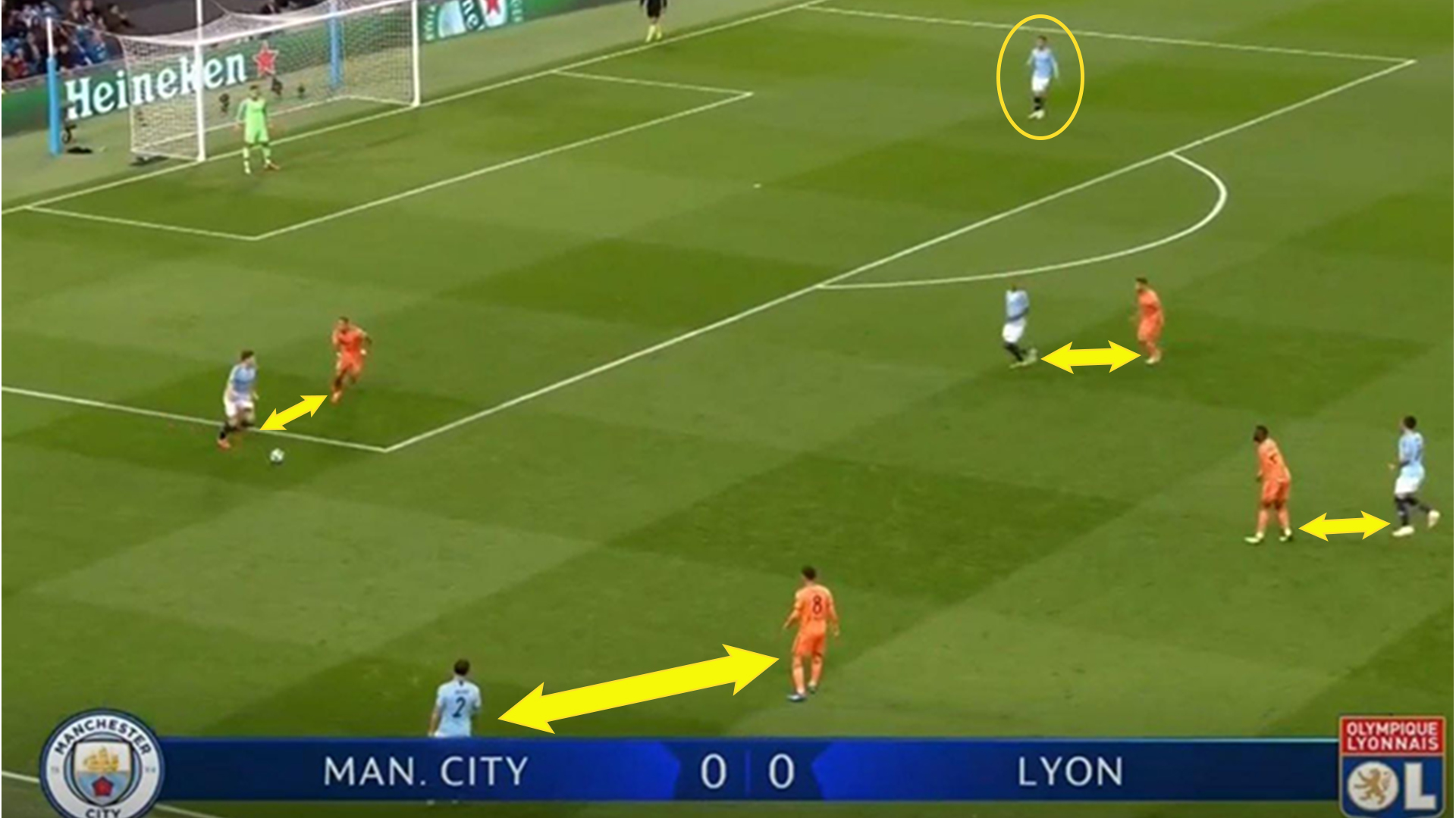 Contre le Real Madrid en huitièmes de finale retour, Manchester City a effectué un pressing haut, très agressif et bien huilé, qui lui a notamment permis d’inscrire deux buts sur deux erreurs individuelles de Raphaël Varane. Contre l’Olympique Lyonnais, on peut imaginer que les hommes de Guardiola procèdent de la même façon avec le cadrage des trois défenseurs centraux lyonnais sur les phases de construction pour les contraindre à dégager sans conviction ou espérer une erreur technique à exploiter. Pour déjouer les pièges du pressing de City, l’OL peut opter pour deux options.