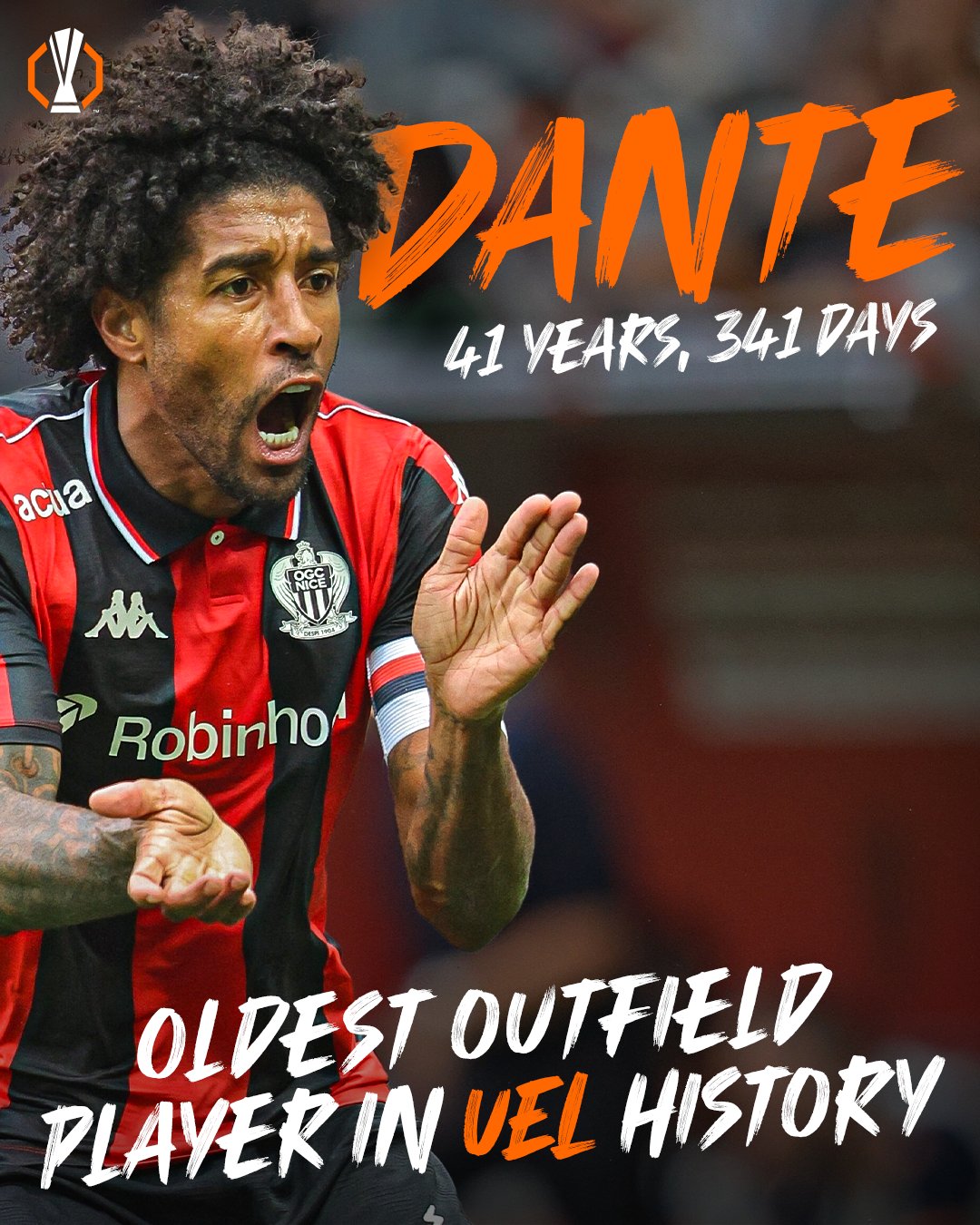 Ce mercredi soir face à l’AS Rome, Dante a marqué l’histoire de la Ligue Europa. À 41 ans, 11 mois et 6 jours, le défenseur central de l’OGC Nice est devenu le joueur de champ le plus âgé à avoir disputé un match dans cette compétition, dépassant l’Espagnol Joaquín, ancien recordman avec 41 ans, 7 mois et 23 jours lors de son dernier match avec le Betis Séville en 2023.