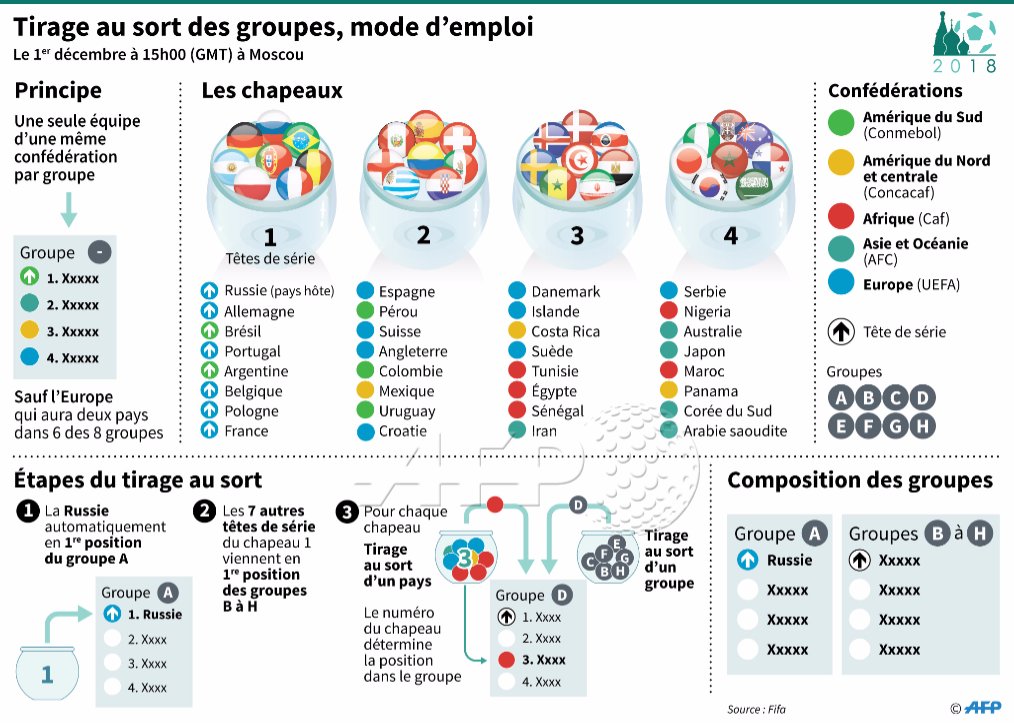 Le verdict tombera vendredi. Le tirage au sort de la phase de poules de la Coupe du Monde 2018 en Russie se tiendra le vendredi 1er décembre à Moscou, à l’intérieur même du Kremlin, (à suivre en live sur Foot Mercato à partir de 15h50). L’épreuve mettra aux prises 32 sélections réparties en 8 groupes de 4 équipes. Hormis les pays européens qui ont droit à deux nations par groupe au maximum, les sélections d’un même continent ne peuvent se retrouver dans un même groupe. Les têtes de série de cette édition ont été désignées uniquement en fonction du classement FIFA du 16 octobre dernier (soit celui qui est intervenu juste après la fin de tous les éliminatoires). Un changement par rapport aux précédentes éditions, où les résultats obtenus lors des Coupes du Monde étaient pris en compte par la FIFA pour choisir les têtes de série. Les Bleus, qualifiés après avoir réalisé le meilleur parcours de leur histoire en éliminatoires avec 23 points, figurent en effet dans le chapeau 1, auprès des autres têtes de série comme la Russie, pays hôte, l’Allemagne (championne du monde en titre), le Portugal (champion d’Europe en titre), le Brésil, l’Argentine, la Belgique et la Pologne. Et comme Didier Deschamps l’a déjà dit, la priorité sera d’éviter l’Espagne, véritable épouvantail du chapeau 2.