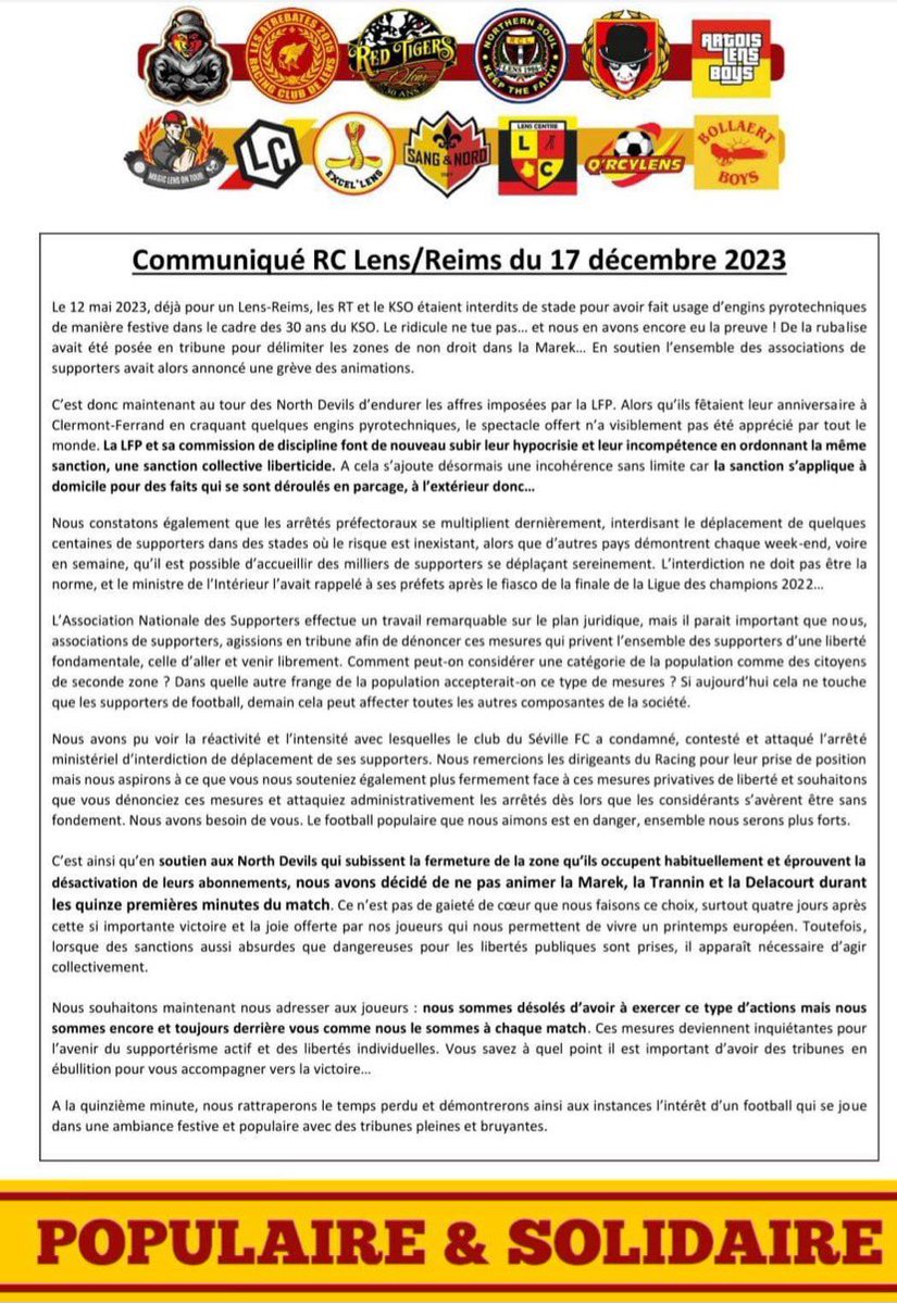 La veille, les Red Tigers 1994, célèbre groupe ultra lensois, ont annoncé le boycott du premier quart d’heure de la partie en vue de protester contre les règles "liberticides" de la LFP ainsi que du Gouvernement français au sortir des différents arrêtés pour interdire les déplacements de supporters. «C’est ainsi en soutien aux North Devils (autre groupe de supporters du RCL ndlr) qui subissent la fermeture de la zone qu’ils occupent habituellement… Nous avons décidé de ne pas animer les tribunes Marek, Trannin et Delacourt durant les quinze premières minutes du match», peut-on lire au sein du communiqué des RT94.